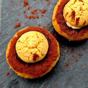 Gefüllt mit einer Mascarpone creme und gekrönt mit einem halbrundem Amarettini, die ihr den letzten Hauch italienischer Tradition verleiht.