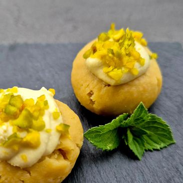 In die sanft eingedrückte Kuhle fließt die Füllung, getoppt mit fein gehackten Pistazien für den perfekten Crunch.